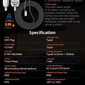 Efikasno punjenje: Brže punjenje u poređenju sa standardnim punjačima, sa snagom od 7kW, 11 kW , zavisno od vaših potreba i uslova na lokaciji gde punite vozilo.